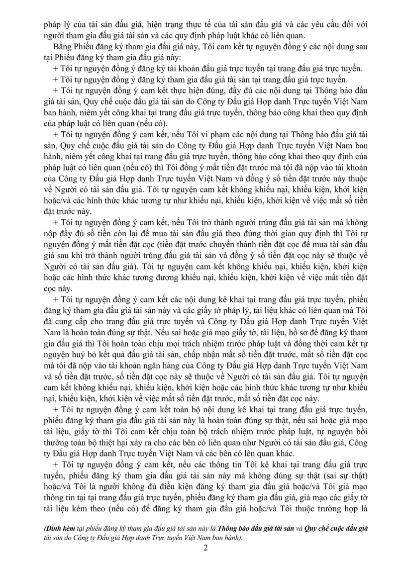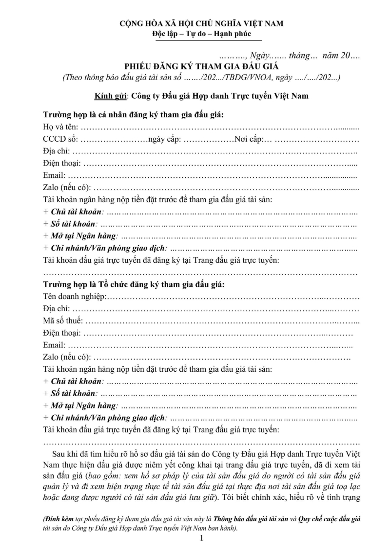 Phiếu đăng ký tham gia đấu giá (Hình thức đấu giá trực tuyến)