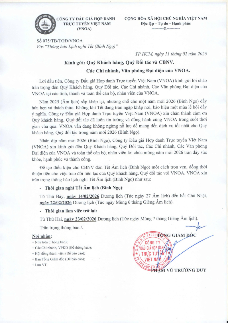 Năm 2025 (Âm lịch) sắp khép lại, nhường chỗ cho một năm mới 2026 (Bính Ngọ) đầy hứa hẹn và thách thức. Không khí Tết đang tràn ngập khắp nơi, báo hiệu một mùa lễ hội đầy ý nghĩa. Công ty Đấu giá Hợp danh Trực tuyến Việt Nam (VNOA) xin chân thành cảm ơn Quý khách hàng, Quý đối tác đã luôn tin tưởng và đồng hành cùng VNOA trong suốt thời gian vừa qua. VNOA vẫn đang không ngừng nỗ lực để mang đến dịch vụ tốt nhất cho Quý khách hàng, Quý đối tác trong năm mới 2026 (Bính Ngọ).